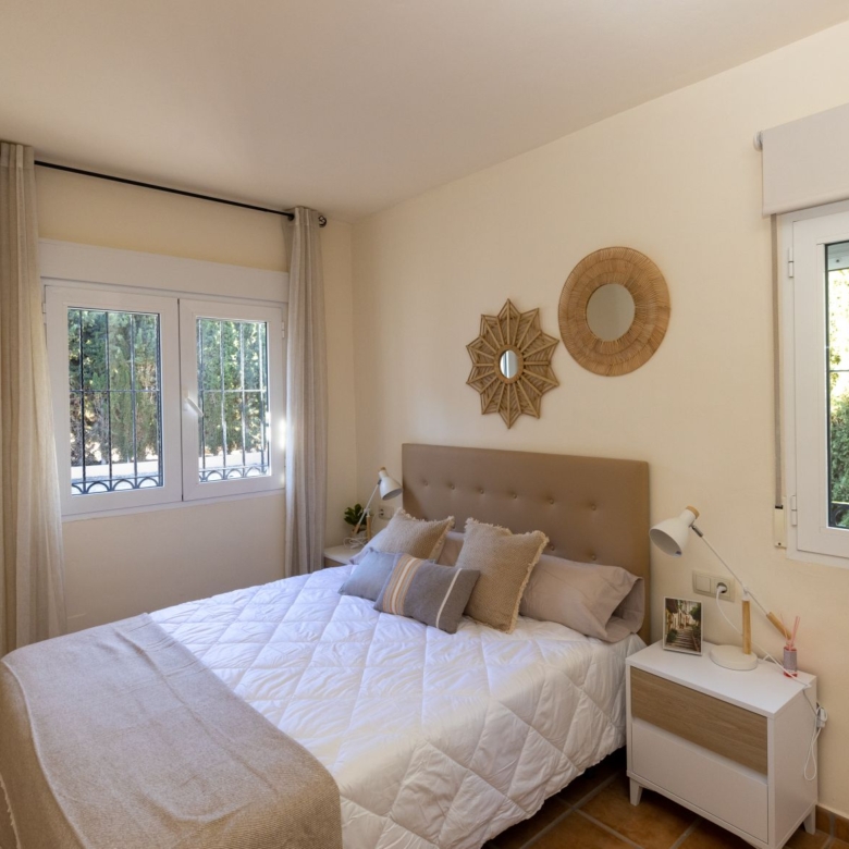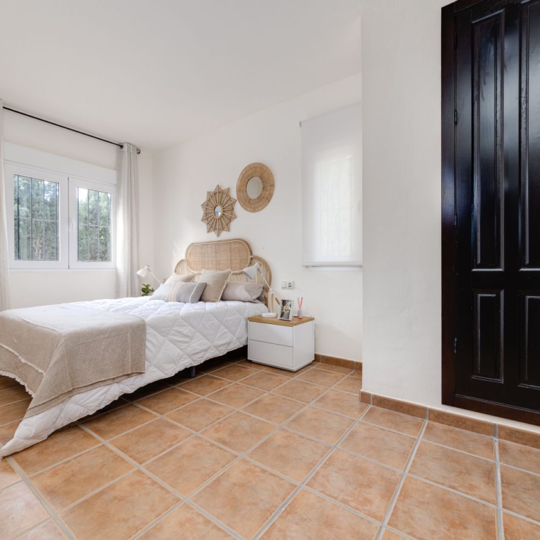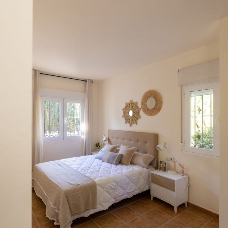 The three bedrooms in this villa are all generously sized and come with large windows that allow for plenty of natural light. The master bedroom has an en-suite bathroom, and the other two bedrooms share a bathroom, making it perfect for families.